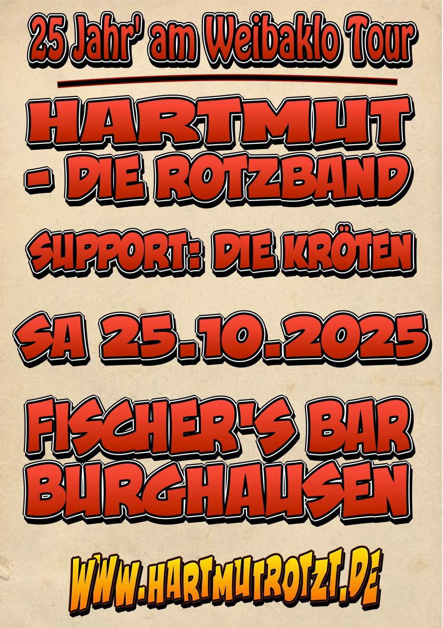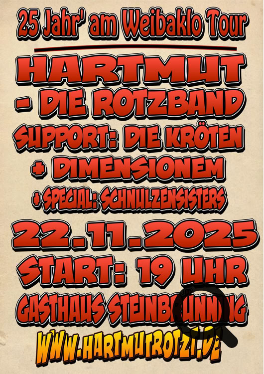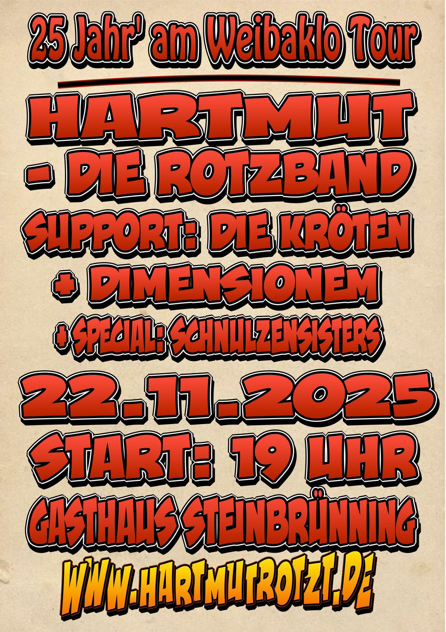 Dabei zelebrieren wir auch oder besonders in 2025, zu unserem Jubiläum, weiterhin Hartrotz und Rotz’n’Roi garniert mit urwüchsigen bayerischen Texten, gemünzt auf eigenes Liedgut, sowie bekanntere aber auch unbekanntere Hard & Heavy Klassiker der Rotzgeschichte!